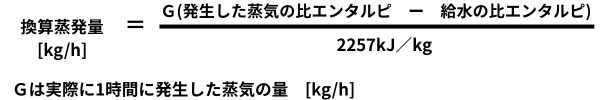 換算蒸発量とは、ボイラーの実際の蒸気発生量を、100℃の飽和水から100℃の乾き飽和蒸気にするための熱量(蒸発熱)で換算した、ボイラーの能力を表す単位です。