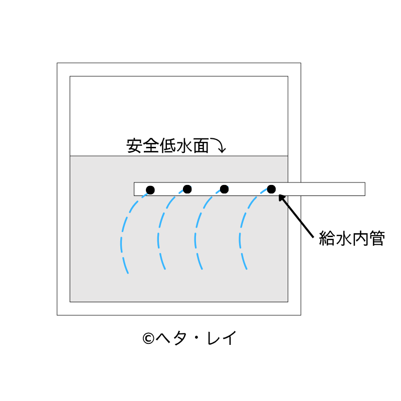 給水内管は、給水を長い管の多数の小さな穴からボイラー胴内の広い範囲に分散して供給します。これにより、冷たい水が少量ずつ、広範囲にゆっくりと混ざり合い、缶水や金属部の急激な温度低下を防ぐことができます。