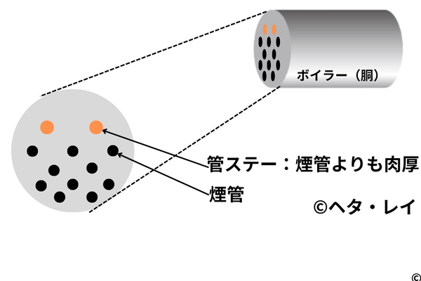 管ステーは、ボイラーの強度を上げる目的で一般に通常の煙管より肉厚な鋼管が使われ、管板へ溶接またはねじ込みで取り付けます。