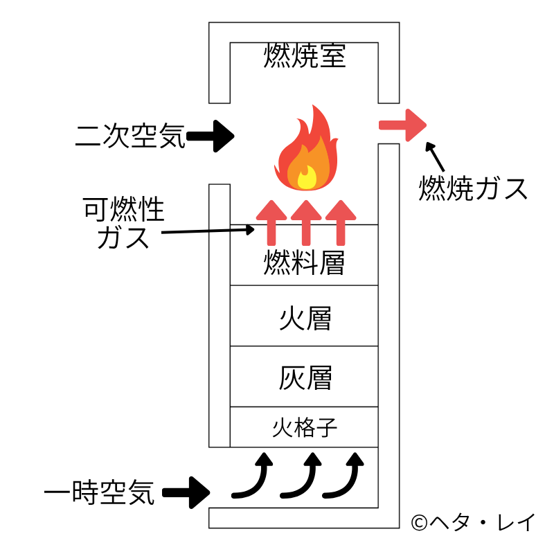 | 4. | 燃焼室は、供給された燃料を速やかに着火・燃焼させ、発生する可燃性ガスと空気との混合接触を良好にして、完全燃焼を行わせる部分である。 | ||