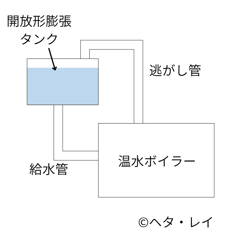 逃がし管は、ボイラーや配管内の水が熱膨張によって増えた分を、高所に設けた開放型膨張タンクへ逃がすための配管です。