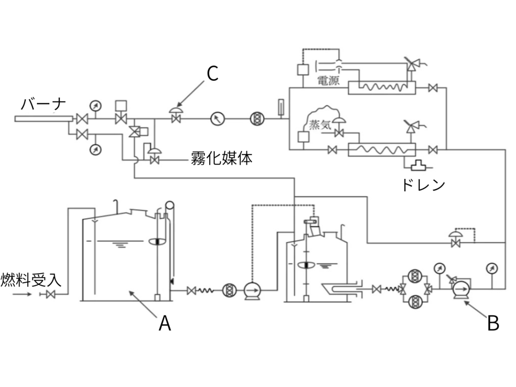燃料油供給装置の構成に関し、次の系統図に示すA~Cの装置の名称の組合せとして、適切なものは次のうちどれか。
